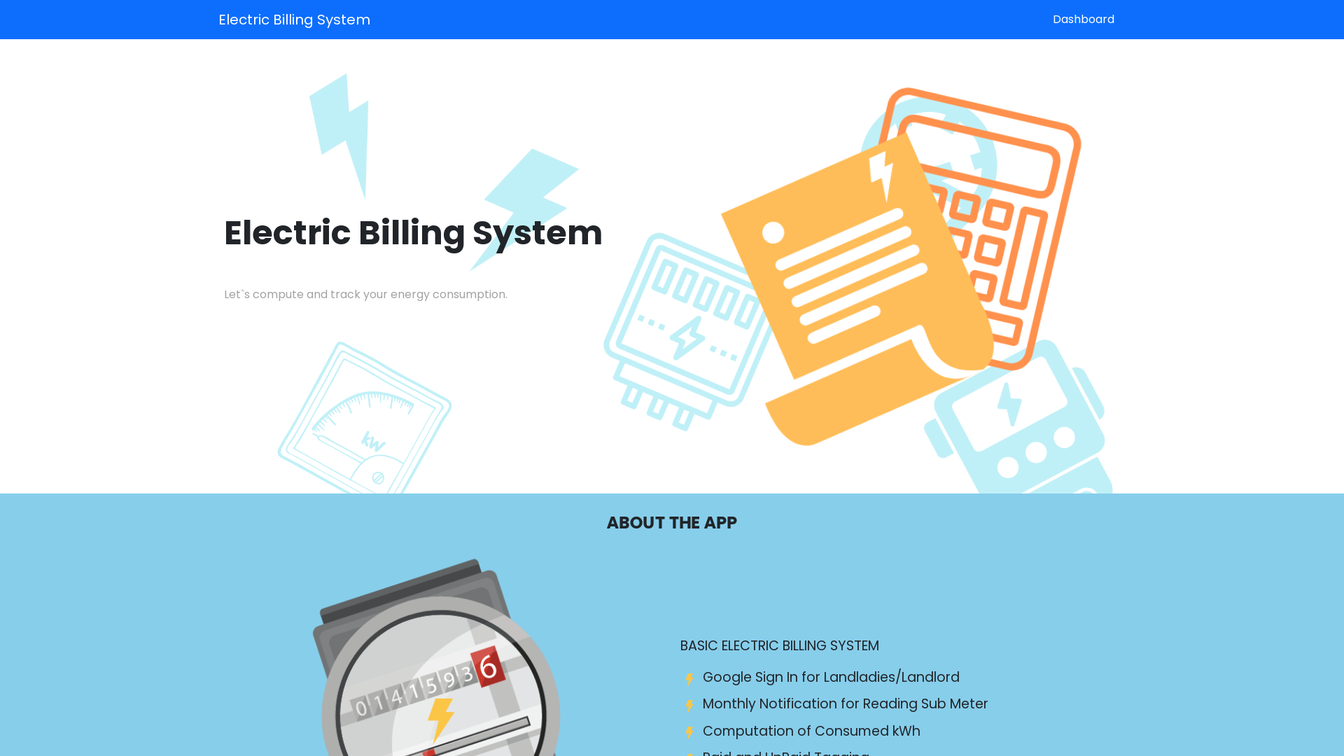 Electric Billing System to create logs and track the Comsumption of our Tenants,It computes the total kwh and amount to be paid by the Tenant, this system also also allows other user create account by logging in using google(Near to Complete,)
